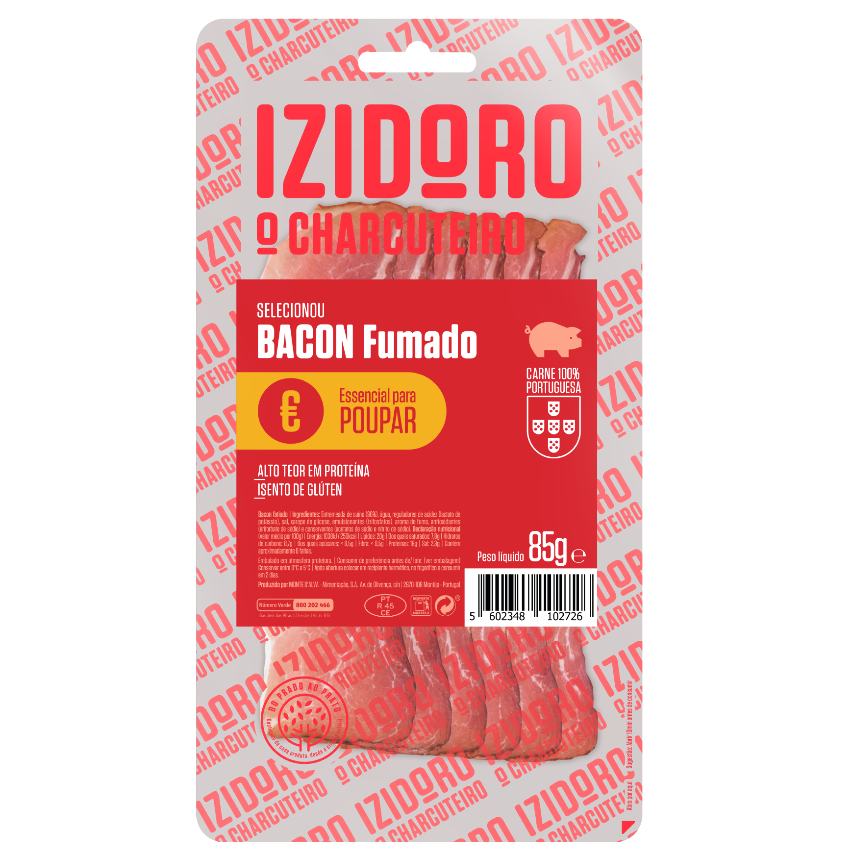 Ingredientes: Entremeada de suíno (96%) (Origem: Portugal). água. regulador de acidez (lactato de potássio). sal. xarope de glicose. emulsionantes (trifosfatos). aroma de fumo. antioxidante (eritorbato de sódio) e conservantes (acetatos de sódio e nitrito de sódio).