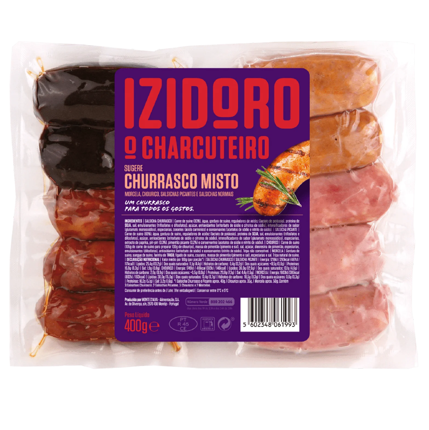 Salsicha Churrasco: Carne de Suíno (83%) (Origem Portugal). água. gordura de súino. regulador de acidez (lactato de potássio). proteína de SOJA. sal. emulsionantes (trifosfatos e difosfatos). Açúcar. antioxidantes (eritorbato de sódio e citratos de sódio). intensificadores de sabor (glutamato monossódico). especiarias. corante (carmina) e conservantes (acetatos de sódio e nitrito de sódio). Salsicha Picante: Carne de Suíno (83%) (Origem Portugal). água. gordura de súino. regulador de acidez (lactato de potássio). proteína de SOJA. sal. emulsionantes (trifosfatos e difosfatos). Açúcar. antioxidantes (eritorbato de sódio e citratos de sódio). intensificador de sabor (glutamato monossódico). especiarias. extrato de paprika. piri-piri (0.3%). pimentão picante (0.2%) e conservantes (acetatos de sódio e nitrito de sódio). Chouriço: Carne de Suíno (105g de carne para preparar 100g de chouriço) (Origem Portugal). massa de pimentão (pimento e sal). sal. Açúcar. oleoresina de pimentão. especiarias. emulsionantes (difosfatos). antioxidante (eritorbato de sódio) e conservante (nitrito de sódio). Tripa não comestível. Morcela: Gordura de Suíno. sangue de suíno. farinha de TRIGO. figado de suíno. couratos. massa de pimentão (pimento e sal). especiarias e sal. Tripa natural de suíno.